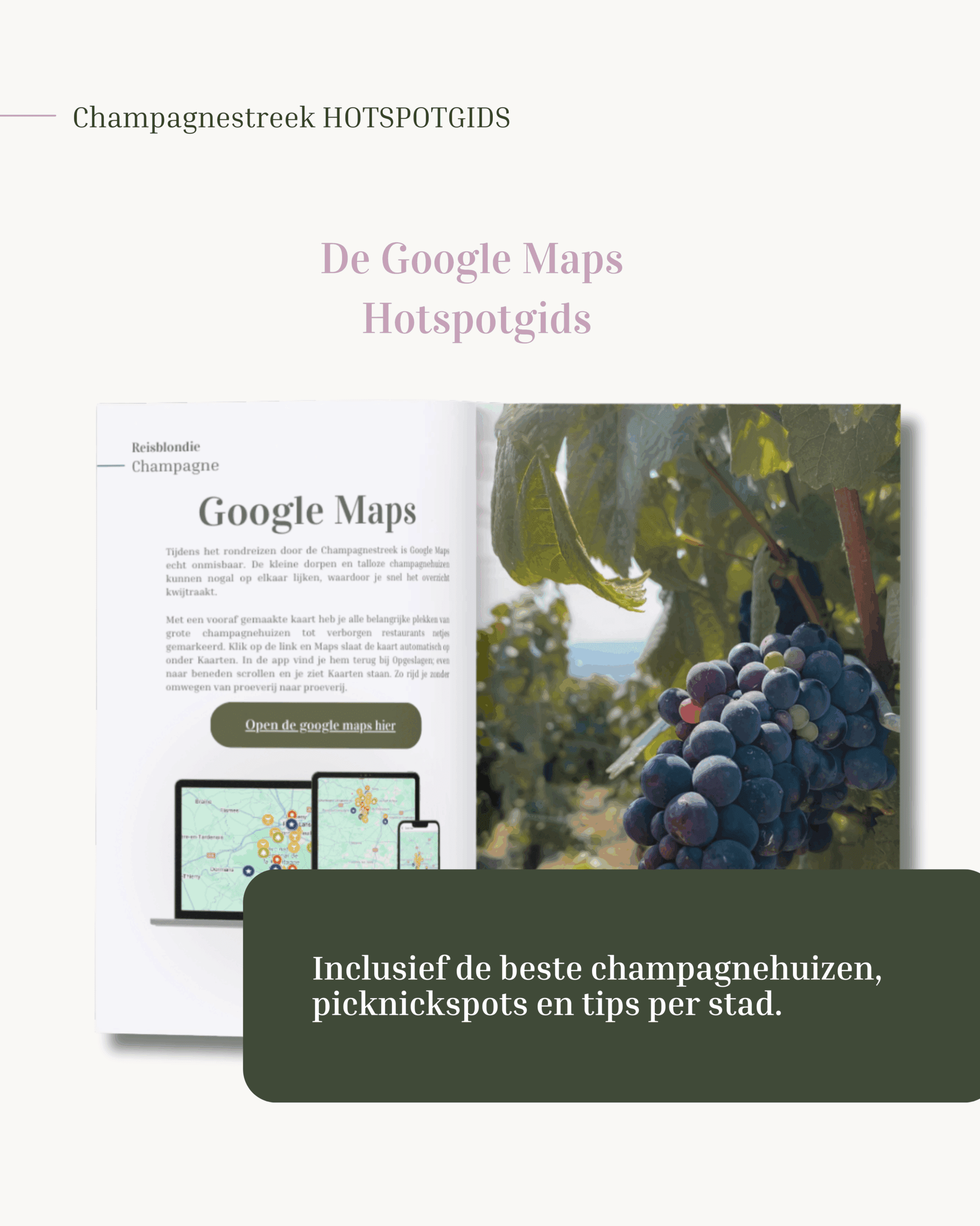 Deze digitale hotspotgids is speciaal samengesteld voor iedereen die de Champagnestreek écht wil ontdekken. Of je nu voor het eerst de wereldberoemde champagnehuizen bezoekt of juist de kleinere huizen en verborgen parels wilt leren kennen, met deze gids heb je alles overzichtelijk bij elkaar. Geen gesleep meer met papieren boekjes: alle informatie staat handig in één document en in de Google maps link.
