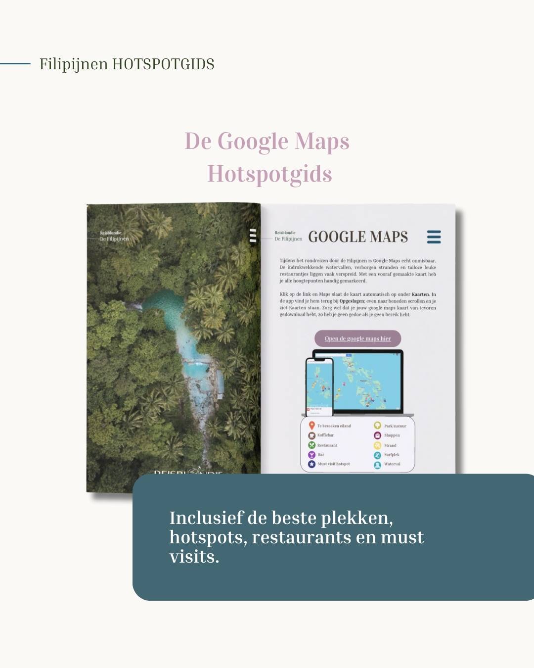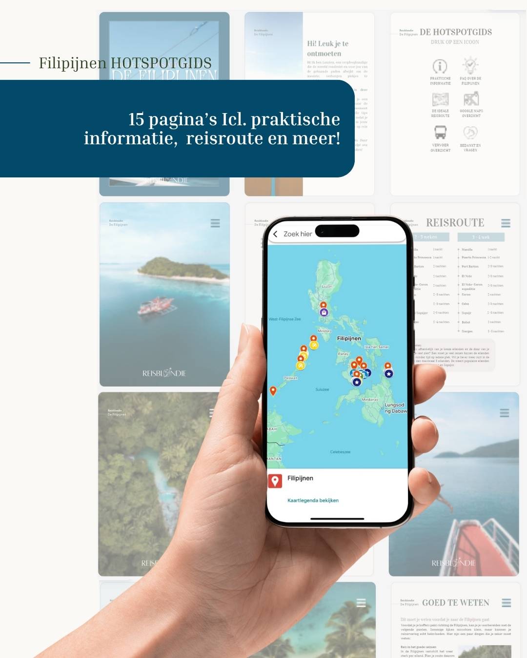 Deze digitale gids is gemaakt voor iedereen die de Filipijnen slim en compleet wil ontdekken. Of je nu droomt van tropische eilanden, witte stranden, rijstterrassen of watervallen: met deze gids heb je alles overzichtelijk bij de hand. Geen papieren boekje meer nodig, want alles staat in één digitaal document dat werkt als een app op je telefoon of tablet, inclusief interactieve Google Maps-links naar alle hotspots.